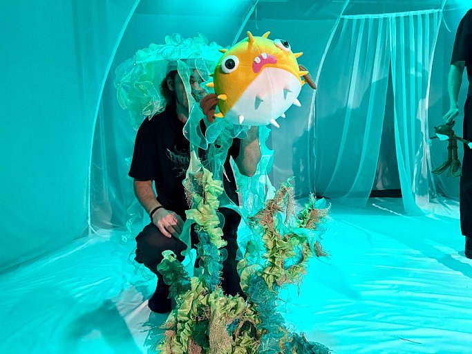 Для юных зрителей важны визуал и звук, поэтому в спектаклях самой младшей категории часто обходятся без сюжета. Такие постановки обычно насыщены тактильными ощущениями, яркими цветовыми и шумовыми эффектами. В премьерной спектакле тоже почти каждое действие сопровождается звуком. Но это не фон, а полноценный участник событий. Желтая рыбка звучит как погремушка. В какие-то моменты вступают гитара, ксилофон, барабан. Звук помогает «прочитать» действие, даже если ребенок еще не связывает его со словами.