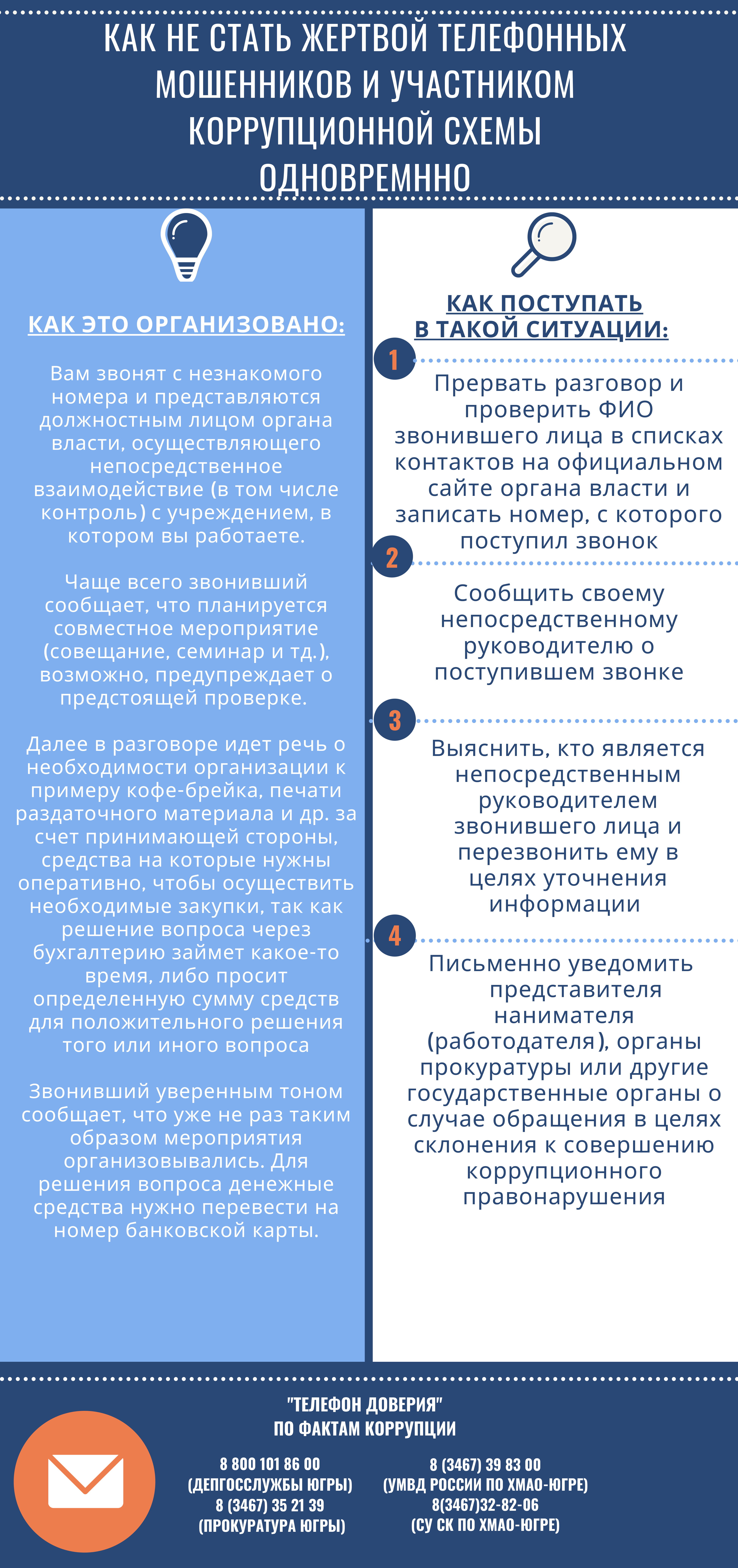 - Сообщение: Сообщить о попытке дачи взятки или ином коррупционном действии своему руководству, в правоохранительные органы, зафиксировать факт.